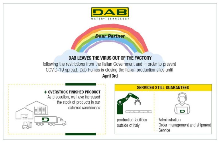 In compliance with the DCPM of 20 March 2020 and in order to counter the spread of the virus, in the protection of all people, DAB Pumps stops the production of all Italian plants until April, the 3rd  Although is…